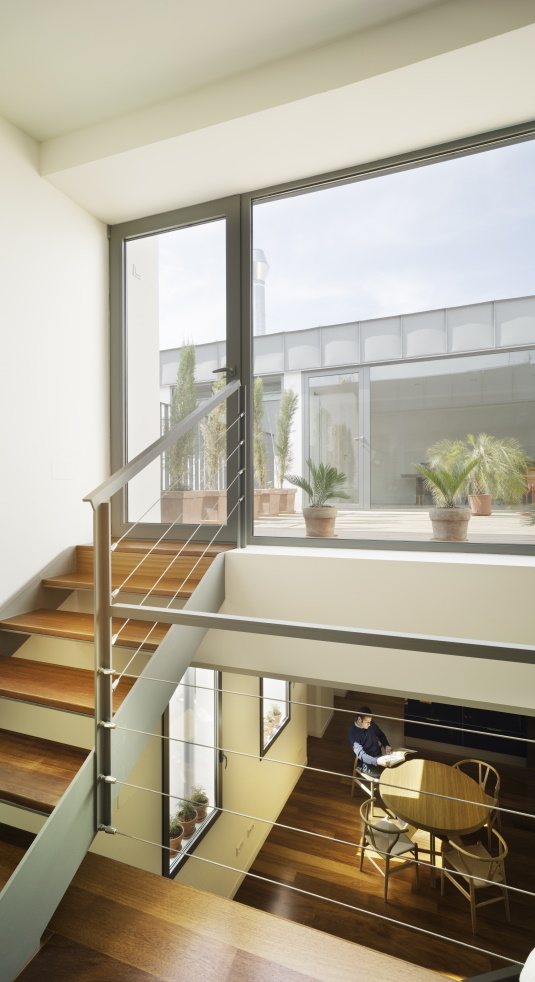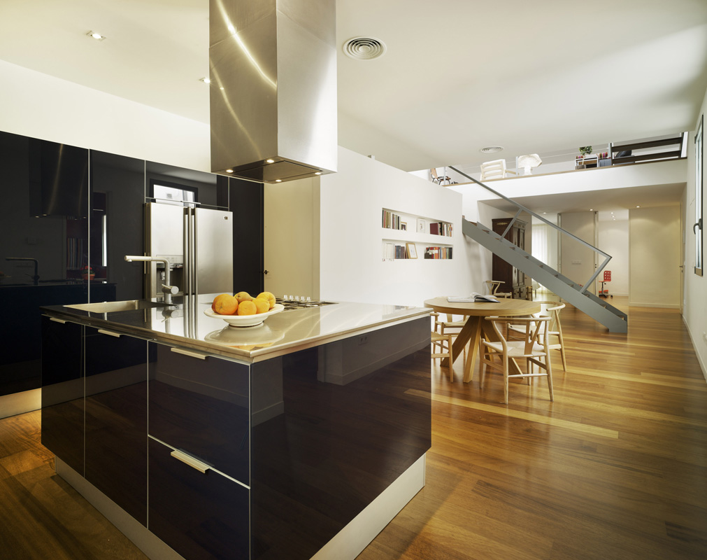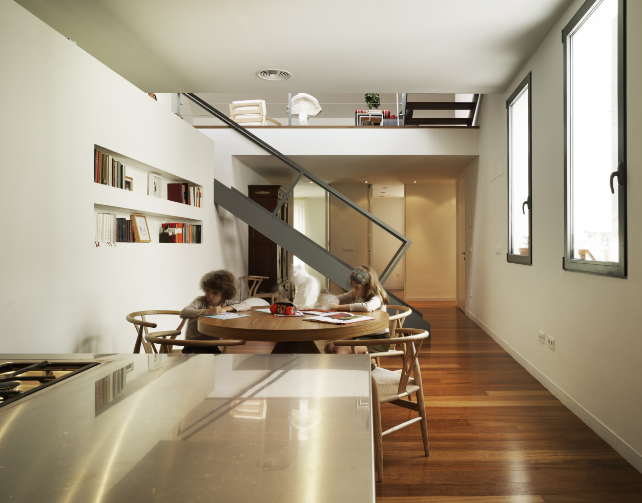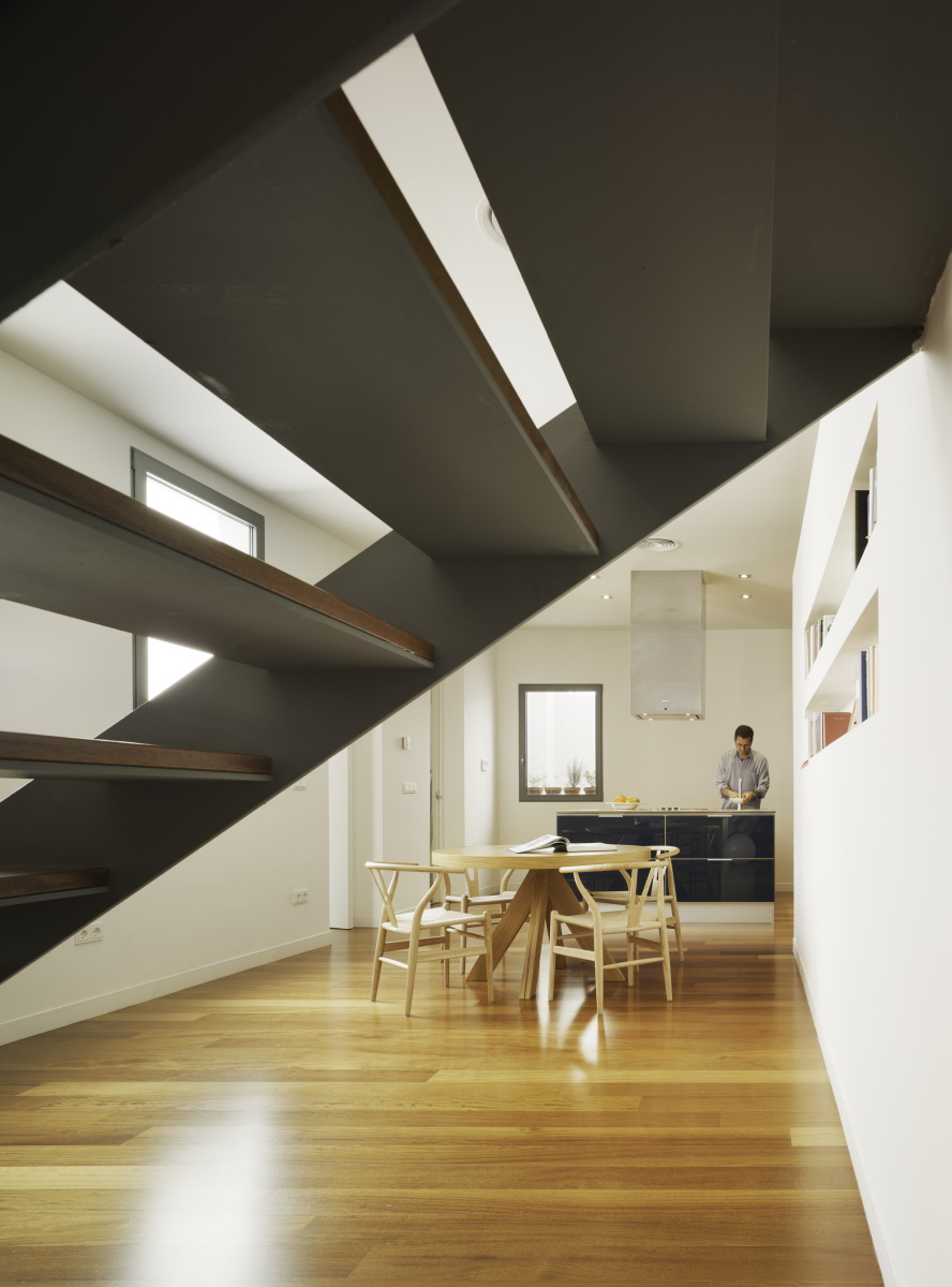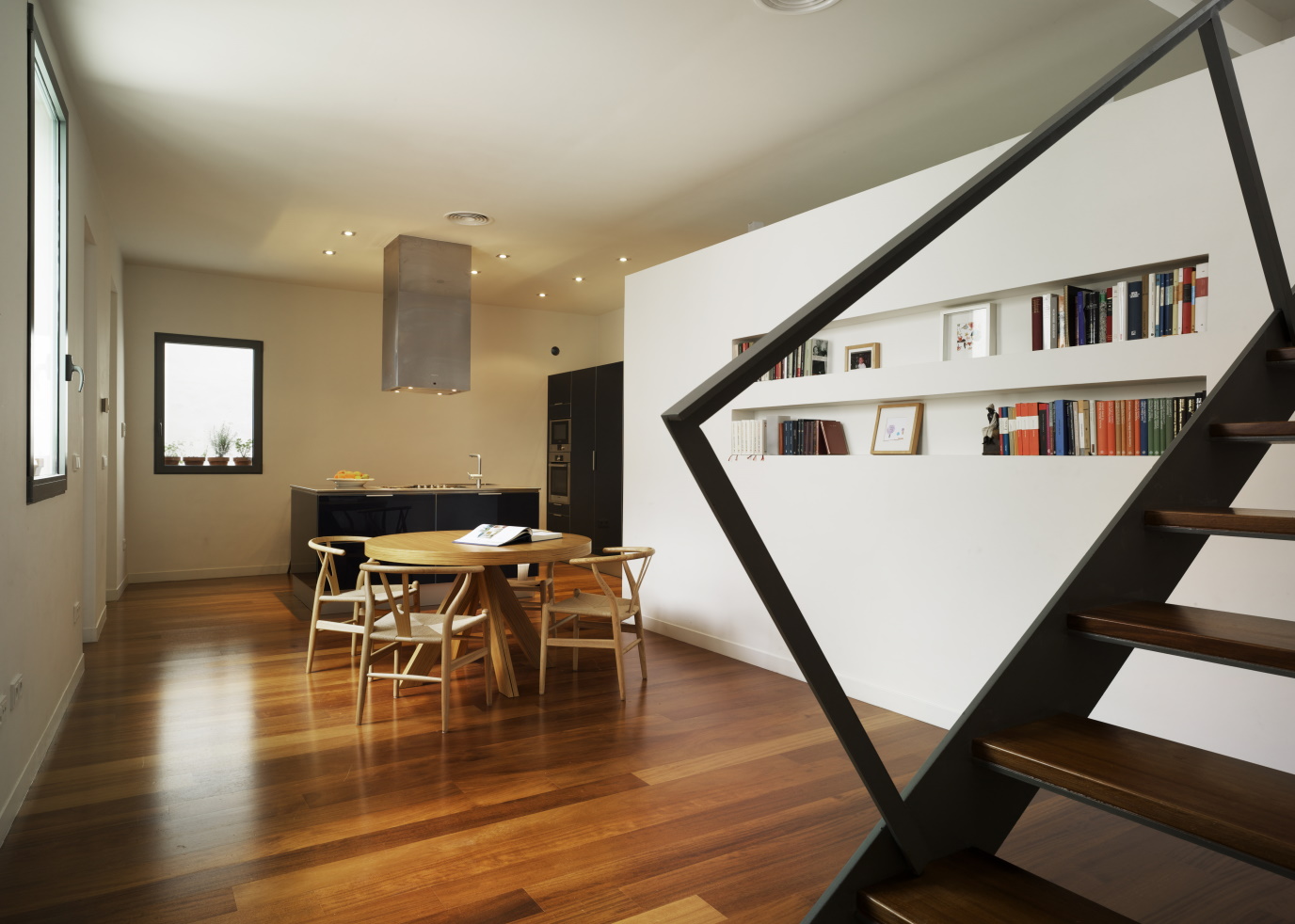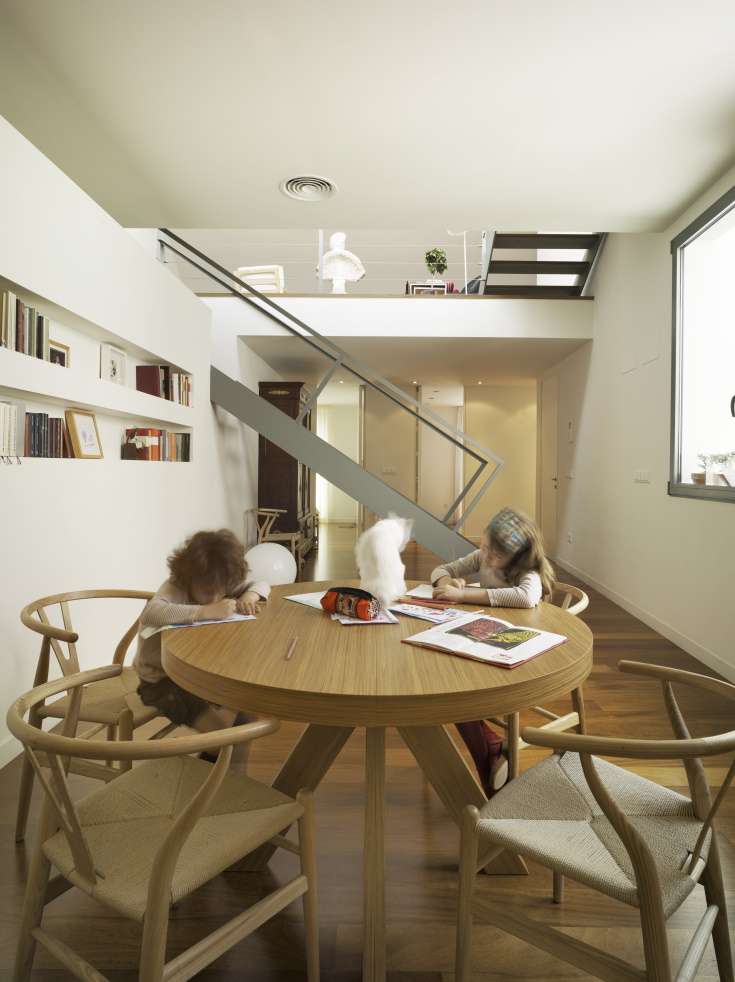 Vivienda de 180 m2 en el centro de la ciudad, estructurada en tres niveles, organizados sobre un espacio común que integra la cocina, comedor, entrada y sala de juegos, comunicado visualmente a través del hueco de la escalera, con el salón situado en el bajocubierta de la planta superior. Un metro más arriba, está situada la terraza. Desde la sala de estar se obtiene una vision de toda la casa.