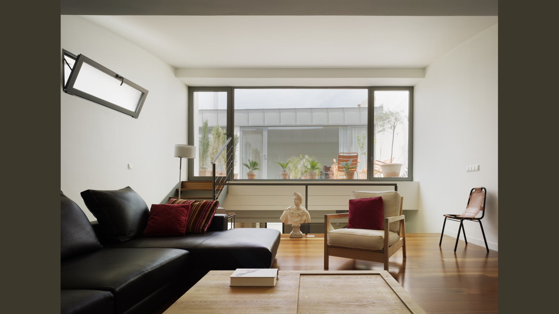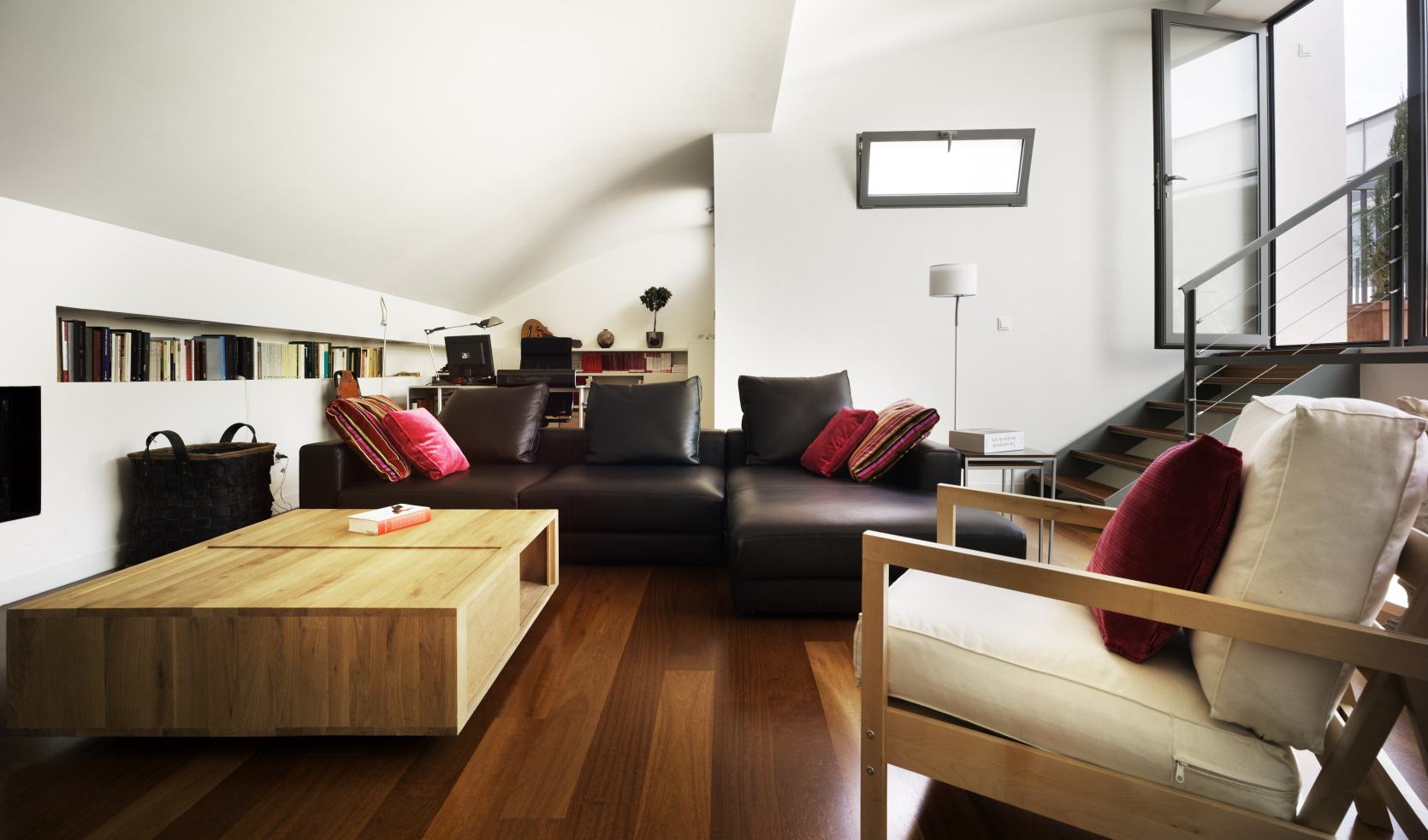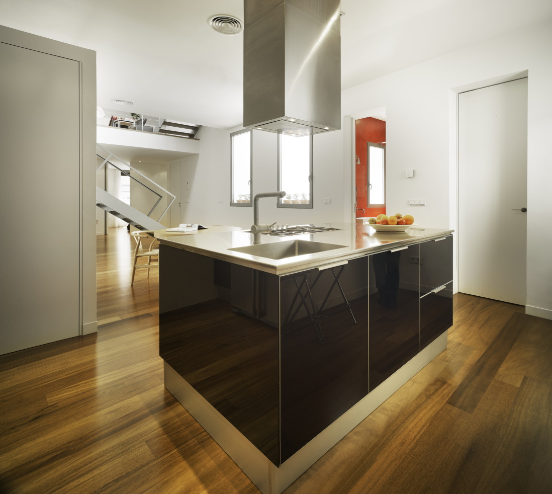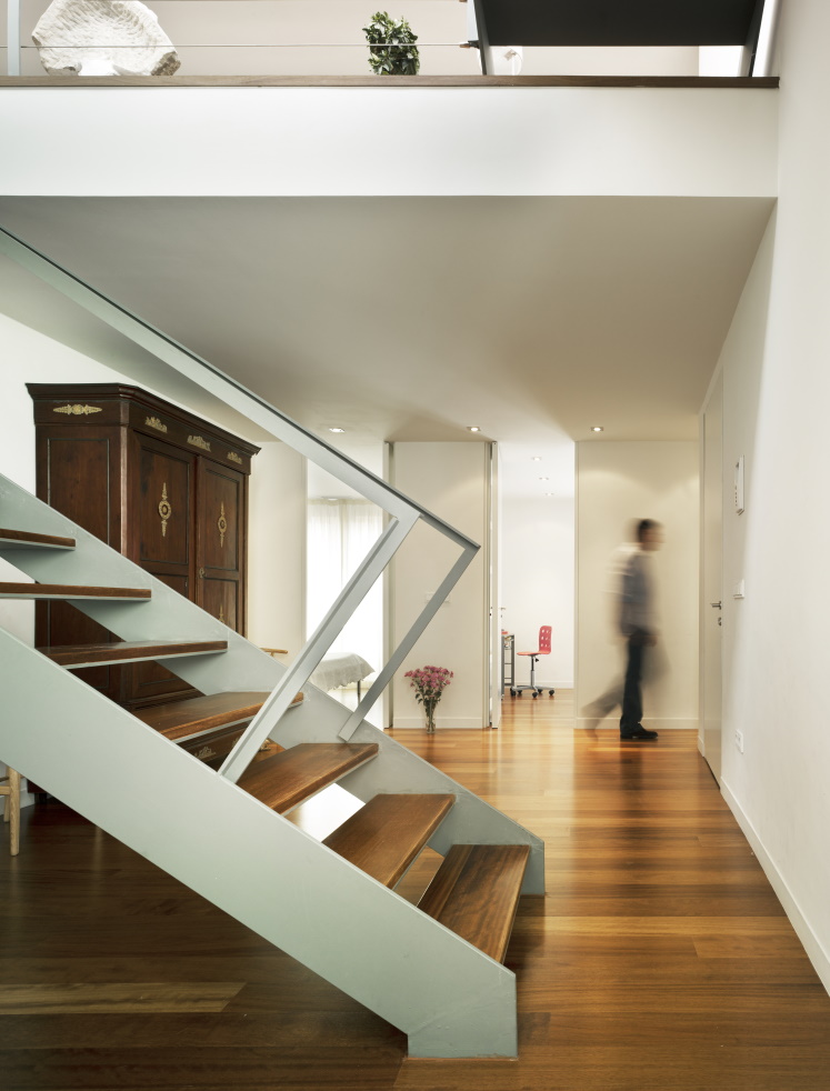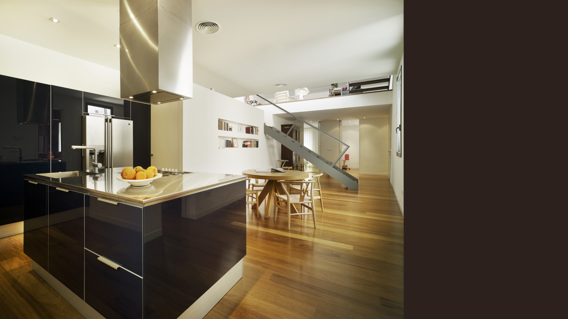Vivienda de 180 m2 en el centro de la ciudad, estructurada en tres niveles, organizados sobre un espacio común que integra la cocina, comedor, entrada y sala de juegos, comunicado visualmente a través del hueco de la escalera, con el salón situado en el bajocubierta de la planta superior. Un metro más arriba, está situada la terraza. Desde la sala de estar se obtiene una vision de toda la casa.